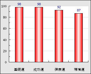 成功運 目的に対する成功運の強さをあらわします。この点数が高いほど自分の思い通りに成功し、逆に悪いと逆境・批判・障害などに苦心します。 98点