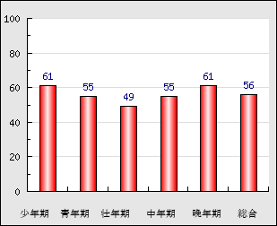| 環境運 | 家庭や職場等での援助運・環境運を司ります。これが良いと配偶者や子供・職場の同僚などから助力が得られやすく、悪いと波乱・不和・孤独などがあります。 | 61点 |