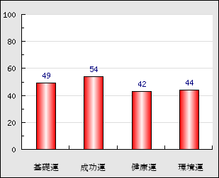 成功運 目的に対する成功運の強さをあらわします。この点数が高いほど自分の思い通りに成功し、逆に悪いと逆境・批判・障害などに苦心します。 54点