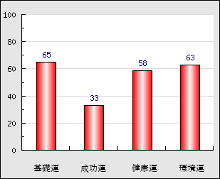 環境運 家庭や職場等での援助運・環境運を司ります。これが良いと配偶者や子供・職場の同僚などから助力が得られやすく、悪いと波乱・不和・孤独などがあります。 63点