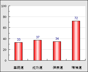 環境運 家庭や職場等での援助運・環境運を司ります。これが良いと配偶者や子供・職場の同僚などから助力が得られやすく、悪いと波乱・不和・孤独などがあります。 72点