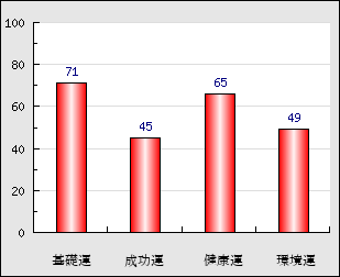 成功運 目的に対する成功運の強さをあらわします。この点数が高いほど自分の思い通りに成功し、逆に悪いと逆境・批判・障害などに苦心します。 45点