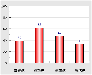 環境運 家庭や職場等での援助運・環境運を司ります。これが良いと配偶者や子供・職場の同僚などから助力が得られやすく、悪いと波乱・不和・孤独などがあります。 33点