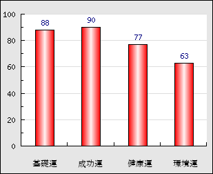 成功運 目的に対する成功運の強さをあらわします。この点数が高いほど自分の思い通りに成功し、逆に悪いと逆境・批判・障害などに苦心します。 90点