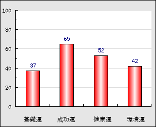 成功運 目的に対する成功運の強さをあらわします。この点数が高いほど自分の思い通りに成功し、逆に悪いと逆境・批判・障害などに苦心します。 65点