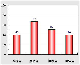 環境運 家庭や職場等での援助運・環境運を司ります。これが良いと配偶者や子供・職場の同僚などから助力が得られやすく、悪いと波乱・不和・孤独などがあります。 40点