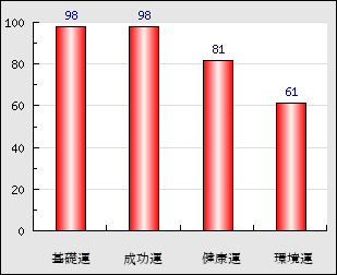 環境運 家庭や職場等での援助運・環境運を司ります。これが良いと配偶者や子供・職場の同僚などから助力が得られやすく、悪いと波乱・不和・孤独などがあります。 61点
