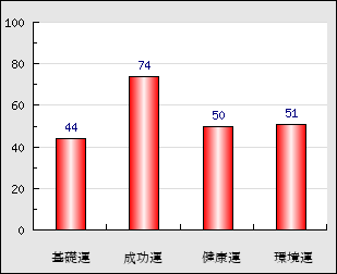 成功運 目的に対する成功運の強さをあらわします。この点数が高いほど自分の思い通りに成功し、逆に悪いと逆境・批判・障害などに苦心します。 74点