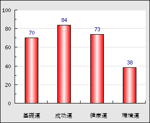 成功運 目的に対する成功運の強さをあらわします。この点数が高いほど自分の思い通りに成功し、逆に悪いと逆境・批判・障害などに苦心します。 84点