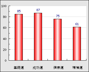 成功運 目的に対する成功運の強さをあらわします。この点数が高いほど自分の思い通りに成功し、逆に悪いと逆境・批判・障害などに苦心します。 87点