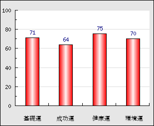 成功運 目的に対する成功運の強さをあらわします。この点数が高いほど自分の思い通りに成功し、逆に悪いと逆境・批判・障害などに苦心します。 64点