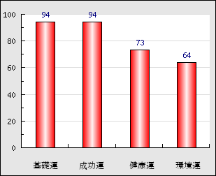 成功運 目的に対する成功運の強さをあらわします。この点数が高いほど自分の思い通りに成功し、逆に悪いと逆境・批判・障害などに苦心します。 94点