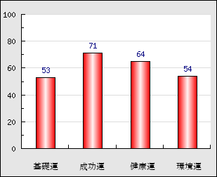 環境運 家庭や職場等での援助運・環境運を司ります。これが良いと配偶者や子供・職場の同僚などから助力が得られやすく、悪いと波乱・不和・孤独などがあります。 54点