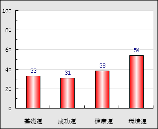 環境運 家庭や職場等での援助運・環境運を司ります。これが良いと配偶者や子供・職場の同僚などから助力が得られやすく、悪いと波乱・不和・孤独などがあります。 54点
