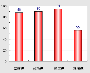 成功運 目的に対する成功運の強さをあらわします。この点数が高いほど自分の思い通りに成功し、逆に悪いと逆境・批判・障害などに苦心します。 90点