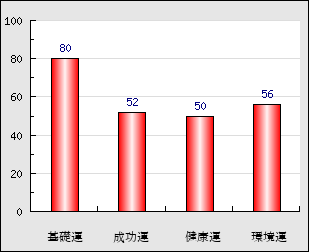 成功運 目的に対する成功運の強さをあらわします。この点数が高いほど自分の思い通りに成功し、逆に悪いと逆境・批判・障害などに苦心します。 52点