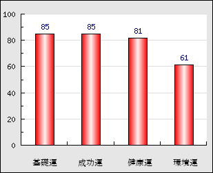 成功運 目的に対する成功運の強さをあらわします。この点数が高いほど自分の思い通りに成功し、逆に悪いと逆境・批判・障害などに苦心します。 85点