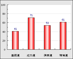成功運 目的に対する成功運の強さをあらわします。この点数が高いほど自分の思い通りに成功し、逆に悪いと逆境・批判・障害などに苦心します。 71点
