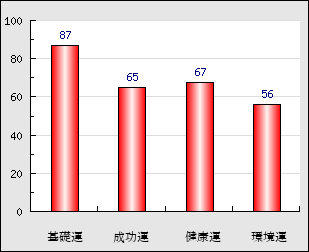 成功運 目的に対する成功運の強さをあらわします。この点数が高いほど自分の思い通りに成功し、逆に悪いと逆境・批判・障害などに苦心します。 65点