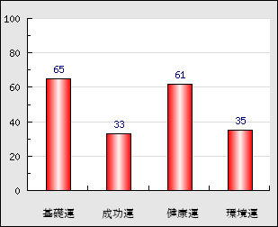 成功運 目的に対する成功運の強さをあらわします。この点数が高いほど自分の思い通りに成功し、逆に悪いと逆境・批判・障害などに苦心します。 33点