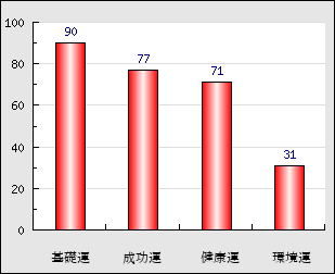 環境運 家庭や職場等での援助運・環境運を司ります。これが良いと配偶者や子供・職場の同僚などから助力が得られやすく、悪いと波乱・不和・孤独などがあります。 31点