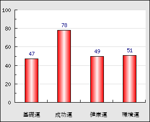 成功運 目的に対する成功運の強さをあらわします。この点数が高いほど自分の思い通りに成功し、逆に悪いと逆境・批判・障害などに苦心します。 78点