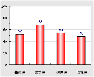 成功運 目的に対する成功運の強さをあらわします。この点数が高いほど自分の思い通りに成功し、逆に悪いと逆境・批判・障害などに苦心します。 68点