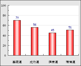 環境運 家庭や職場等での援助運・環境運を司ります。これが良いと配偶者や子供・職場の同僚などから助力が得られやすく、悪いと波乱・不和・孤独などがあります。 51点