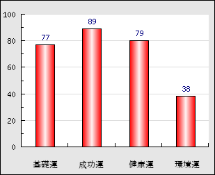 環境運 家庭や職場等での援助運・環境運を司ります。これが良いと配偶者や子供・職場の同僚などから助力が得られやすく、悪いと波乱・不和・孤独などがあります。 38点