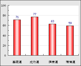 成功運 目的に対する成功運の強さをあらわします。この点数が高いほど自分の思い通りに成功し、逆に悪いと逆境・批判・障害などに苦心します。 77点