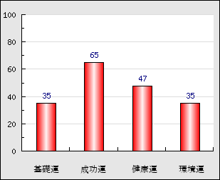 成功運 目的に対する成功運の強さをあらわします。この点数が高いほど自分の思い通りに成功し、逆に悪いと逆境・批判・障害などに苦心します。 65点