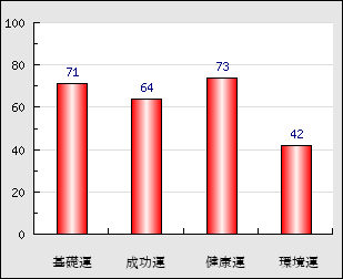 環境運 家庭や職場等での援助運・環境運を司ります。これが良いと配偶者や子供・職場の同僚などから助力が得られやすく、悪いと波乱・不和・孤独などがあります。 42点