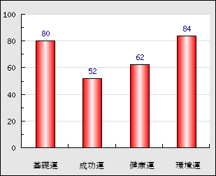 環境運 家庭や職場等での援助運・環境運を司ります。これが良いと配偶者や子供・職場の同僚などから助力が得られやすく、悪いと波乱・不和・孤独などがあります。 84点