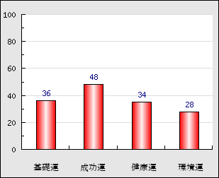 成功運 目的に対する成功運の強さをあらわします。この点数が高いほど自分の思い通りに成功し、逆に悪いと逆境・批判・障害などに苦心します。 48点