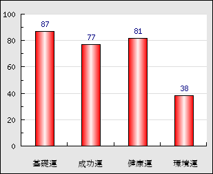 環境運 家庭や職場等での援助運・環境運を司ります。これが良いと配偶者や子供・職場の同僚などから助力が得られやすく、悪いと波乱・不和・孤独などがあります。 38点