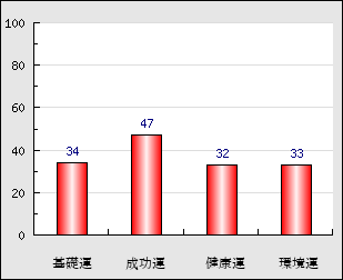 成功運 目的に対する成功運の強さをあらわします。この点数が高いほど自分の思い通りに成功し、逆に悪いと逆境・批判・障害などに苦心します。 47点