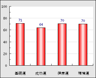 成功運 目的に対する成功運の強さをあらわします。この点数が高いほど自分の思い通りに成功し、逆に悪いと逆境・批判・障害などに苦心します。 64点