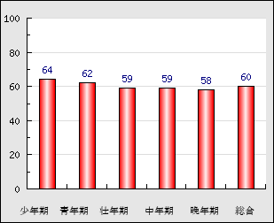 ※年代別運勢グラフは、あくまでも時期別の運勢を概算したものですので参考程度にご覧ください。少年期や青年期の運勢が平均と比べて高い場合は比較的若い頃に成功や幸福があり、反対に中年期や晩年期の運勢が平均と比べて高い場合は後年に華開く大器晩成型と言えるでしょう。ただし、少年期の運勢が低いからと言って、若い頃は成功しないといったことではありません。
