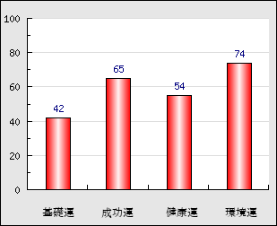 成功運 目的に対する成功運の強さをあらわします。この点数が高いほど自分の思い通りに成功し、逆に悪いと逆境・批判・障害などに苦心します。 65点