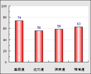 環境運 家庭や職場等での援助運・環境運を司ります。これが良いと配偶者や子供・職場の同僚などから助力が得られやすく、悪いと波乱・不和・孤独などがあります。 63点