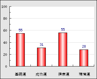 成功運 目的に対する成功運の強さをあらわします。この点数が高いほど自分の思い通りに成功し、逆に悪いと逆境・批判・障害などに苦心します。 31点