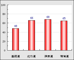 環境運 家庭や職場等での援助運・環境運を司ります。これが良いと配偶者や子供・職場の同僚などから助力が得られやすく、悪いと波乱・不和・孤独などがあります。 65点