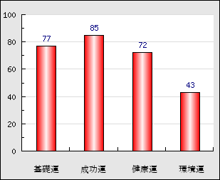 環境運 家庭や職場等での援助運・環境運を司ります。これが良いと配偶者や子供・職場の同僚などから助力が得られやすく、悪いと波乱・不和・孤独などがあります。 43点