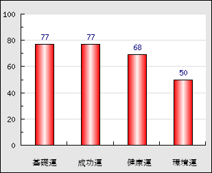 環境運 家庭や職場等での援助運・環境運を司ります。これが良いと配偶者や子供・職場の同僚などから助力が得られやすく、悪いと波乱・不和・孤独などがあります。 50点