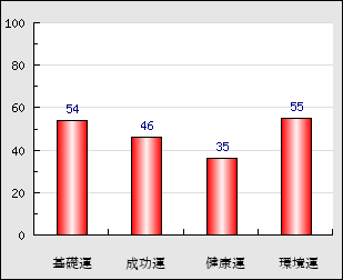 環境運 家庭や職場等での援助運・環境運を司ります。これが良いと配偶者や子供・職場の同僚などから助力が得られやすく、悪いと波乱・不和・孤独などがあります。 55点