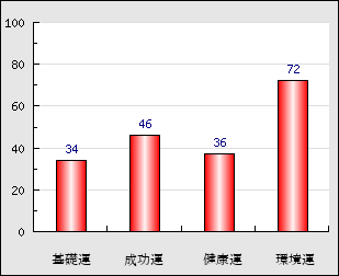 成功運 目的に対する成功運の強さをあらわします。この点数が高いほど自分の思い通りに成功し、逆に悪いと逆境・批判・障害などに苦心します。 46点