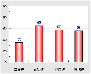 成功運 目的に対する成功運の強さをあらわします。この点数が高いほど自分の思い通りに成功し、逆に悪いと逆境・批判・障害などに苦心します。 65点