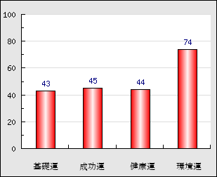 環境運 家庭や職場等での援助運・環境運を司ります。これが良いと配偶者や子供・職場の同僚などから助力が得られやすく、悪いと波乱・不和・孤独などがあります。 74点