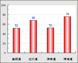 環境運 家庭や職場等での援助運・環境運を司ります。これが良いと配偶者や子供・職場の同僚などから助力が得られやすく、悪いと波乱・不和・孤独などがあります。 76点