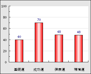 成功運 目的に対する成功運の強さをあらわします。この点数が高いほど自分の思い通りに成功し、逆に悪いと逆境・批判・障害などに苦心します。 70点